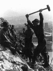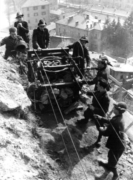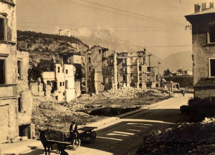 Trento bombardata; sullo sfondo il Doss col mausoleo di Battisti