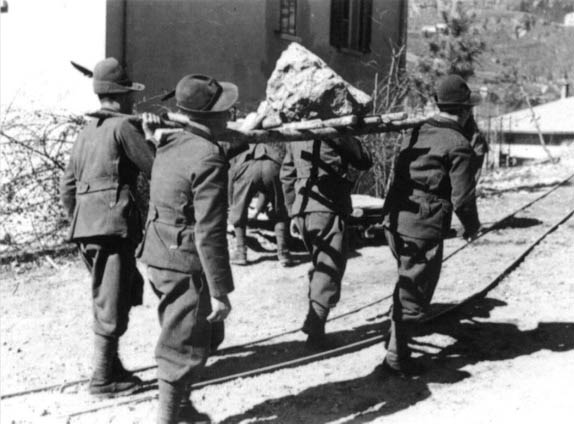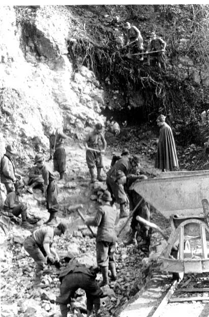Tutto il materiale per la costruzione- trasportato sul Doss a dorso di mulo o a piedi, quando non era possibile fare diversamente- veniva lavorato da Alpini scalpellini e proveniva da due cave locali: una prima presso la frazione di Cadine e successivamente anche da una nella zona dei Solteri.
