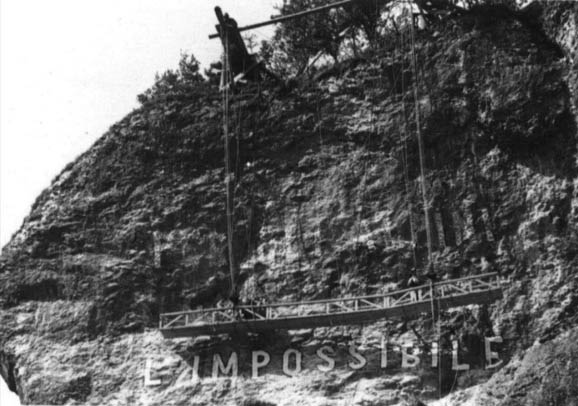 Durante i lavori, il Capitano Cesare Paroldo, allora comandante del distaccamento (il quale poi, da Maggiore, combatterà in Russia con il Btg Val Chiese della Tridentina), fece realizzaresullaparete occidentale del Doss la famosa scritta nella roccia “PER GLI ALPINI NON ESISTE L’IMPOSSIBILE”, che ben illustrava, oltre alla caratteristica pregnante delle Penne Nere in armi, anche lo sforzo fatto dai suoi uomini per costruire la strada con così pochi mezzi a disposizione. Le lettere, alte 120 cm per una profondità di 20 cm, furono scolpite a mano dagli scalpellini del distaccamento grazie ad un ingegnoso ponte mobile sospeso.