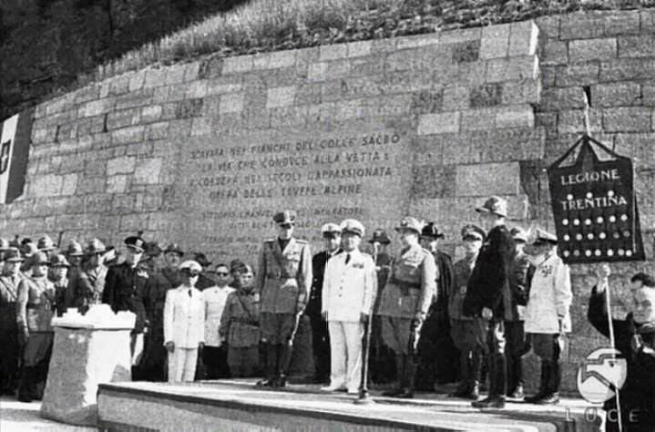 Fu nel ventennale della fine della Grande Guerra, nel 1938, che in occasione della 19ª Adunata Nazionale degli Alpini, svoltasi proprio a Trento, venne accolta dal Governo la proposta formulata dalla Legione Trentina (sodalizio costituito nel 1917 per iniziativa di alcuni fuoriusciti, per unire tutti i volontari trentini arruolatisi nell’Esercito Italiano) di costituire un complesso in onore del Corpo degli Alpini – nel quale avevano militato moltissimi trentini irredenti- che nel passato conflitto mondiale si era battuto in un ambiente operativo difficilissimo e dalle cui gesta era derivato un alone di leggenda destinato a penetrare profondamente nella cultura nazionale, diventando simbolo di vittoria ed assieme di difesa e sicurezza del territorio italiano. L’idea ebbe ovviamente il pieno ed entusiastico appoggio dell’Ispettorato Truppe Alpine e del 10° Reggimento Alpini (denominazione di allora dell’ Associazione Nazionale Alpini).