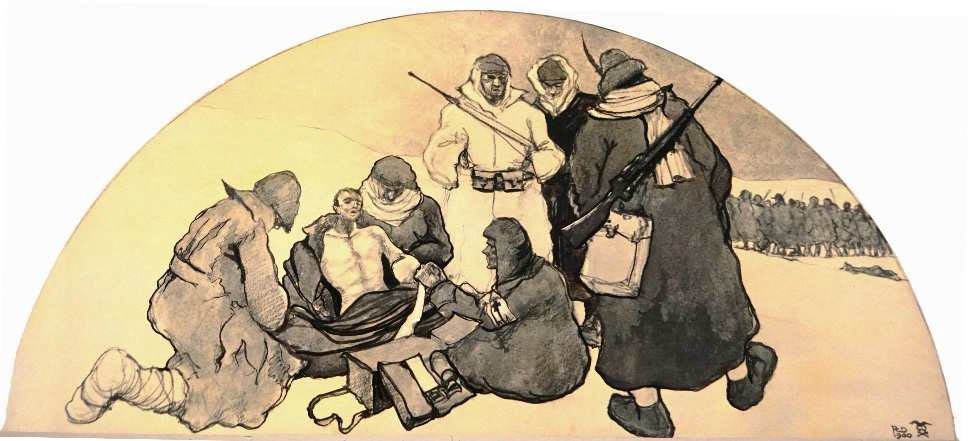 Caccia Dominioni volle realizzare anche di sua mano, sulla parete di fronte all’entrata del Museo, il pannello raffigurante “La morte del Capitano” ispirato dalla motivazione della MOVM “alla memoria” del Capitano Giuseppe Grandi del Btg.Tirano , caduto in Russia.