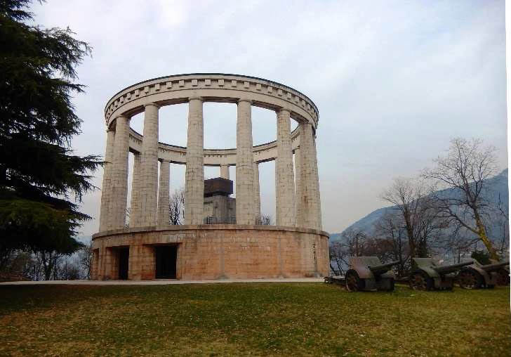 Tornando al primo dopoguerra, negli anni ’30 dello scorso secolo sul Doss Trento era stato eretto un mausoleo dedicato a Cesare Battisti, l’irridentista martire nato proprio a Trento il 4 febbraio 1875 e qui impiccato dagli Austriaci il 12 luglio 1016 dopo essere stato catturato, ufficiale degli Alpini, sul Monte Corno assieme a Fabio Filzi. Nella volontà di onorarne la memoria nella sua città, nel 1922 era stata promulgata una legge per l’erezione a Trento di un monumento a lui dedicato, da posizionarsi sul Doss, che lo Stato italiano aveva concesso gratuitamente l’anno prima alla città. Il progetto, di stile classico e celebrativo, fu approvato nel 1926 e, affidato all’architetto veronese Ettore Fagiuoli, venne terminato nel 1935 e inaugurato il 26 maggio di quell’anno, con l’inumazione al suo interno delle spoglie mortali dell’eroe trentino.